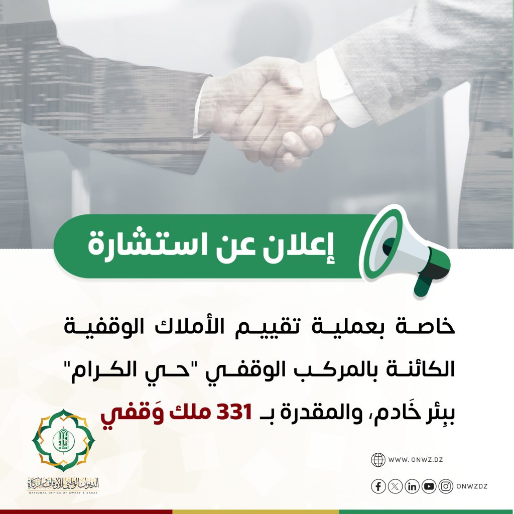 إعلَان عَن استشَارة رقم 07 / د و أ ز / م ع / م أ م / 2025 الخاصَّة بعمليَّة تَقييم الأملَاك الوَقفيَّة الكَائنة بالمُركَّب الوَقفي “حي الكرام” ببِئر خَادم والمُقدَّرة بــ 331 مُلك وَقفِي