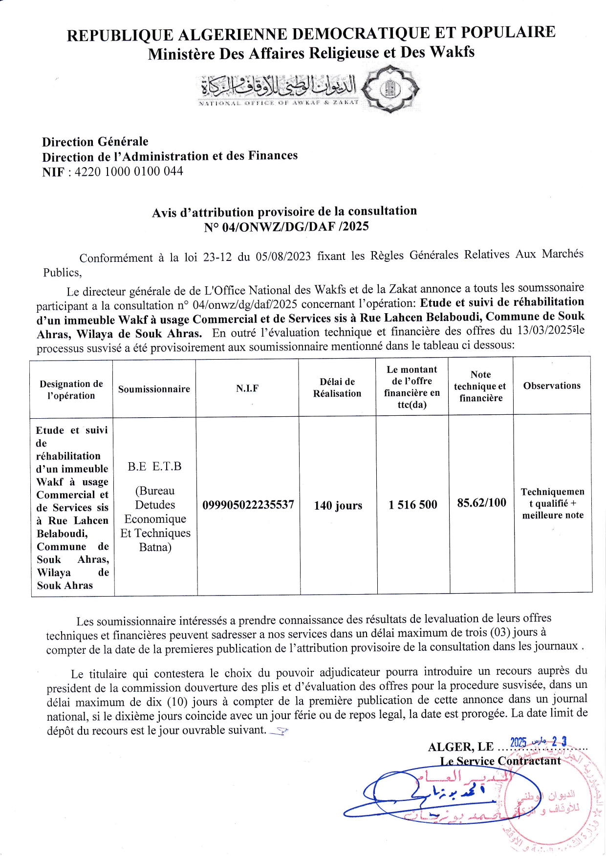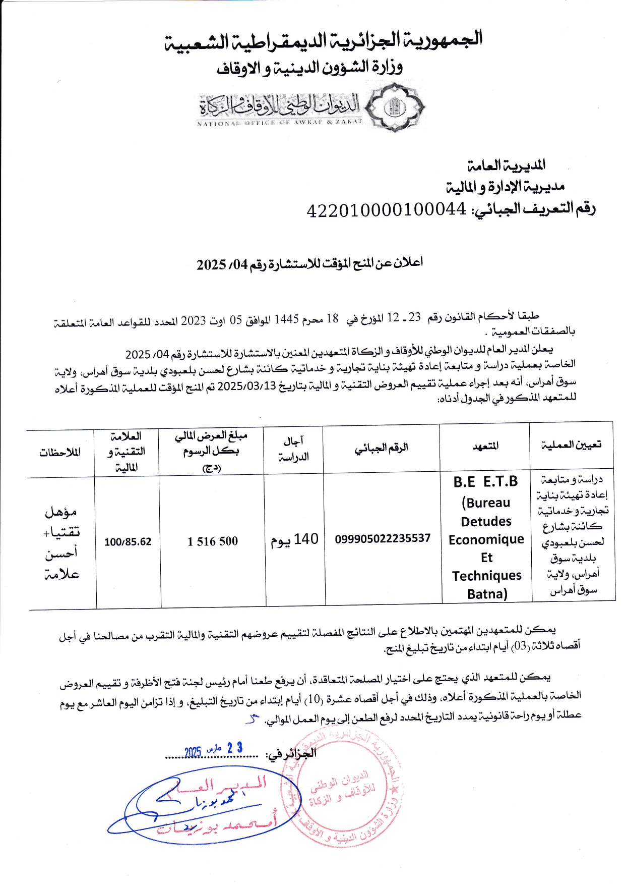 يُعلن الديوَان الوَطني للأوقَاف والزَّكاة عَن المنح المُؤقّت للاستشَارة رَقم 2025/04، المُتعلِّقة بعملية دراسة ومتابعة إعادة تهيئة بناية تجارية وخدماتية كائنة بشارع لحسن بلعبودي بلدية سوق أهراس، ولاية سوق أهراس.