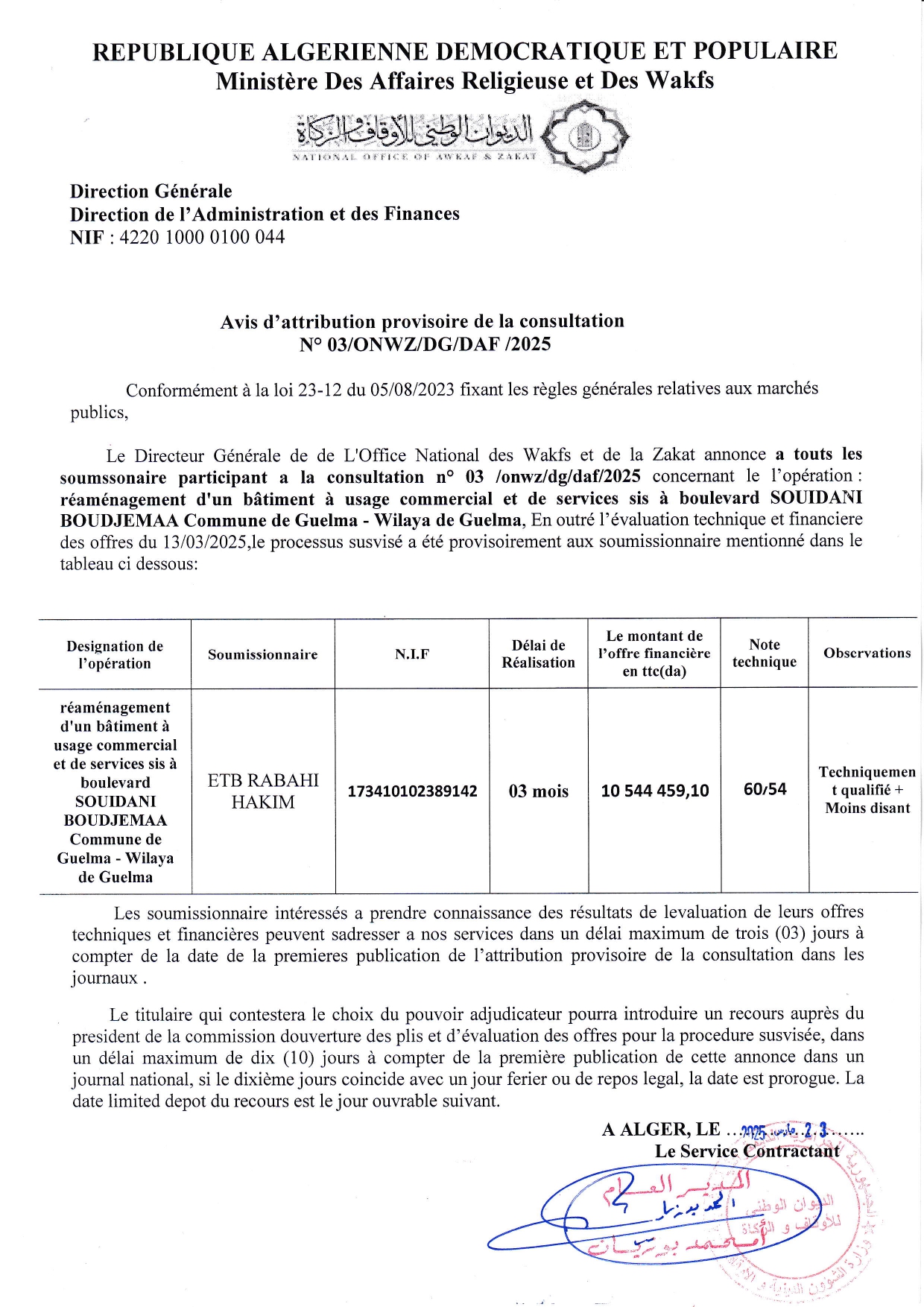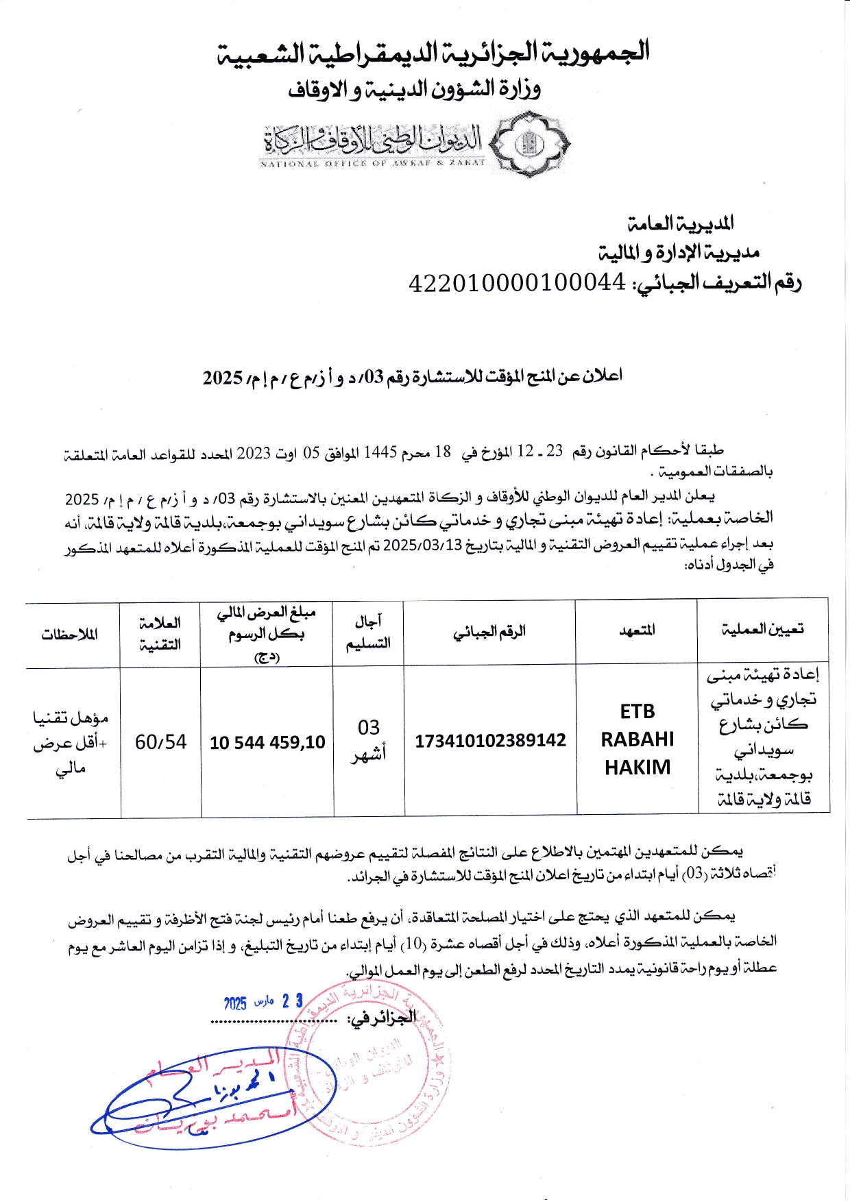 يُعلن الديوَان الوَطني للأوقَاف والزَّكاة عَن المنح المُؤقّت للاستشَارة رَقم 2025/03، المُتعلِّقة بعملية إعادة تهيئة مبنى تجاري وخدماتي كائنة بشارع سويداني بوجمعة بلدية قالمة، ولاية قالمة.