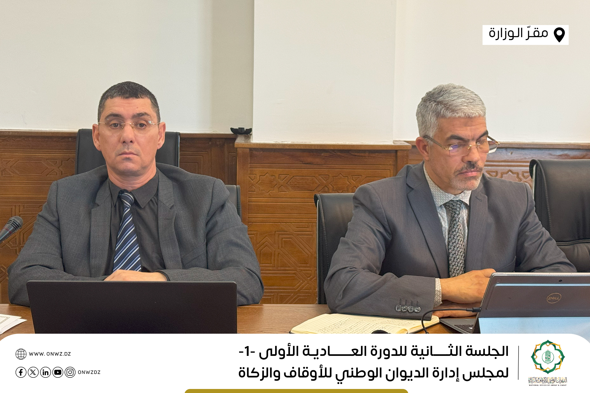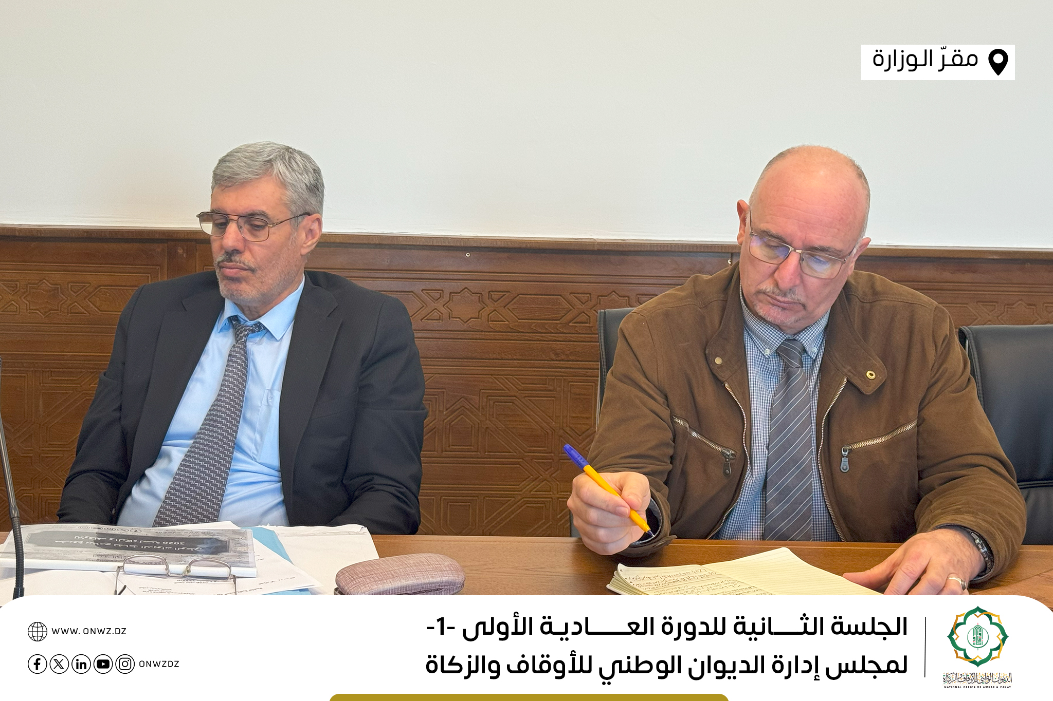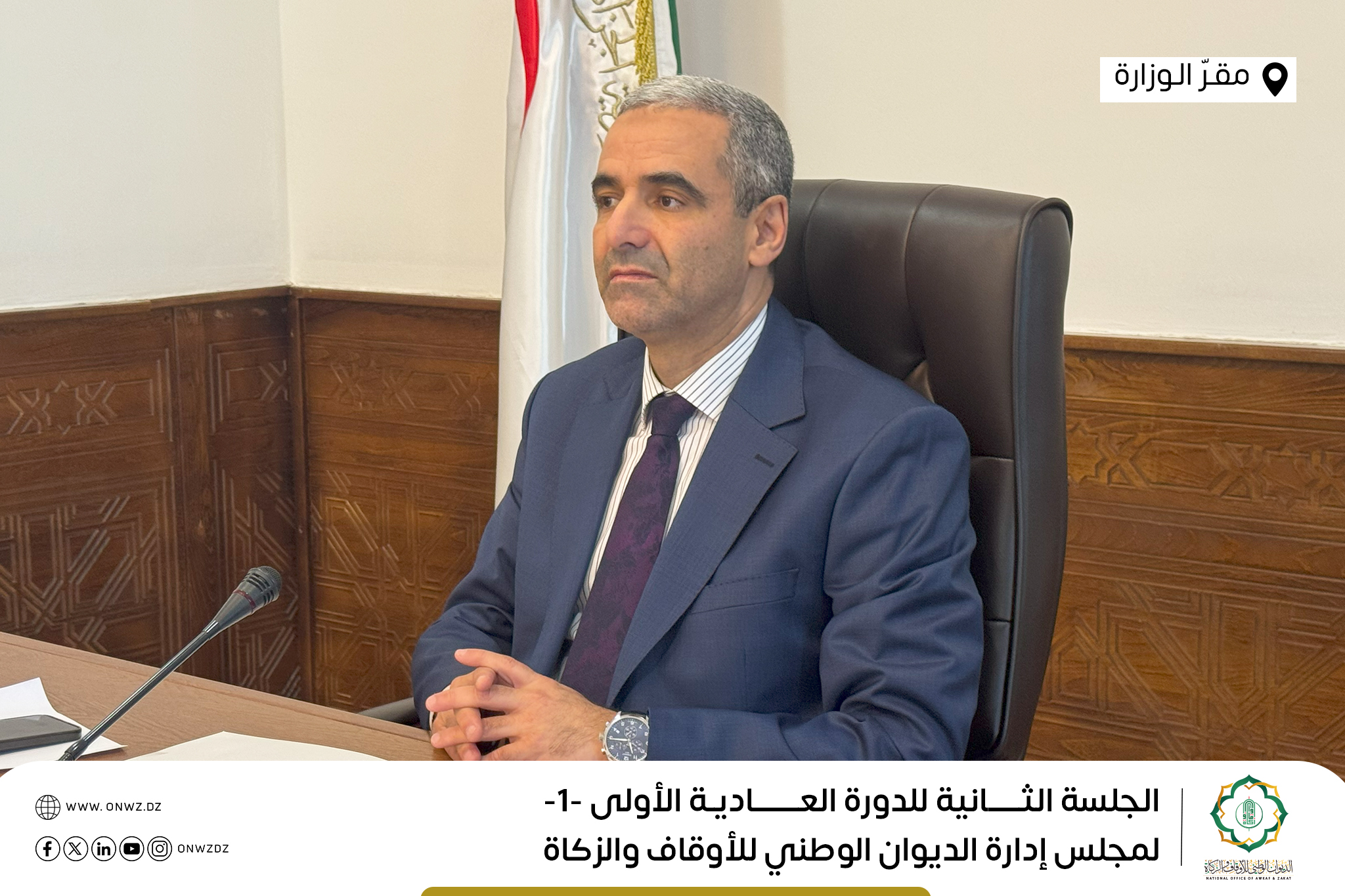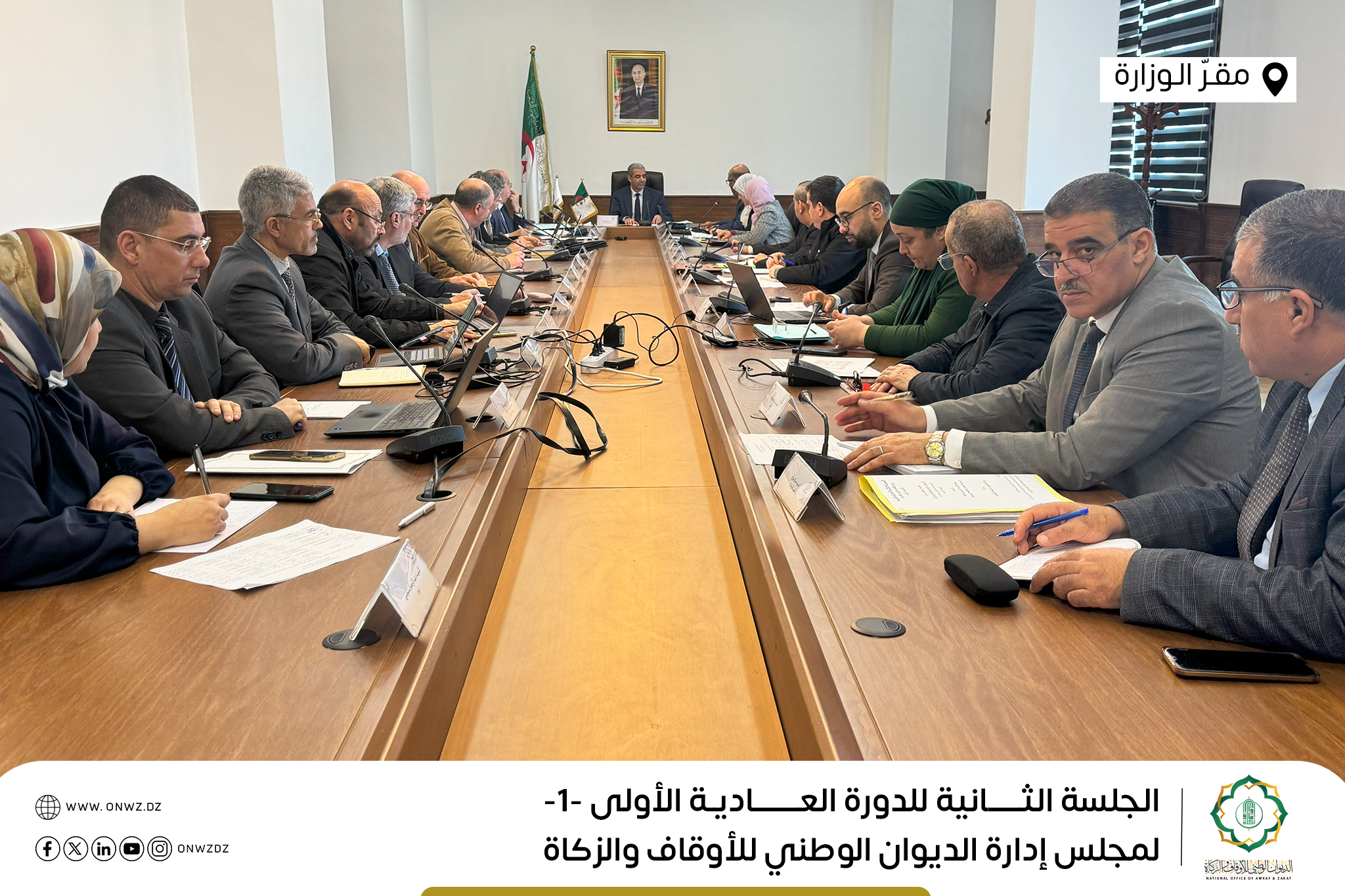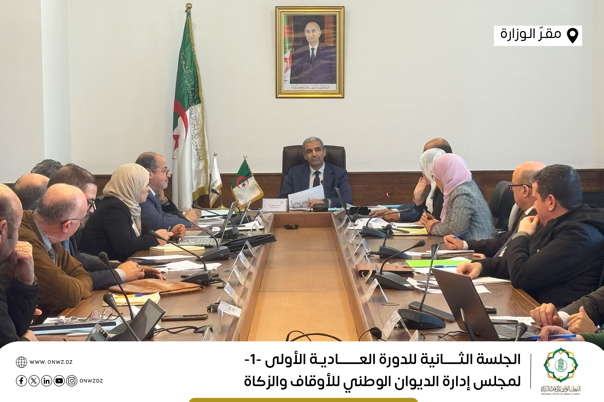 انعقاد الجَلسَة الثّانيَة للدّورَة العَاديَّة الأولى (1) لمَجلِس إدَارة الدّيوَان الوَطنيّ للأوقَاف والزّكاة بَمَقَرّ وزارة الشؤون الدينية والأوقاف الجزائر.. تَحتَ إشرَاف السّيّد الأمين العَام للوزارَة وَرئيسُ مجلِس الإدارَة “السّيّد رضوان معاش”، وَبحُضُور المُدير العَام للدّيوَان الوَطَنِي للأوقَاف وَالزَّكَاة “السيّد أمحمد بوزيان”، ومُشَاركَة إطَارَات الدّيوَان وَمُمثّلي مُختلف القطَاعات الوزاريّة والمُؤسّسات المعنيّة والخُبَرَاء.