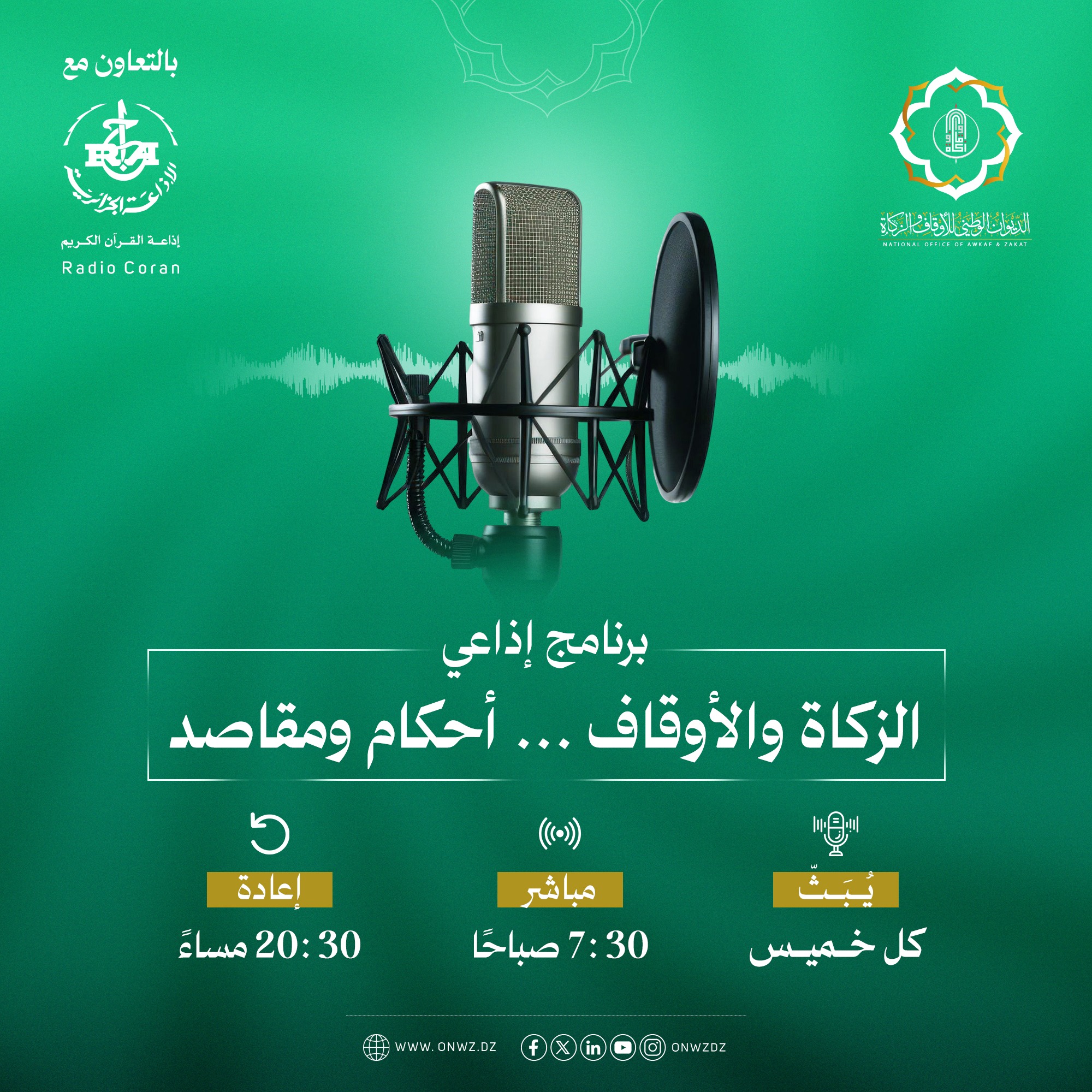 تابعُونا على أثير إذاعَة القرآن الكريم، يومَ الخَميس من كلّ أسبُوع ضمنَ برنامَج “الزّكَاة والأوقَاف .. أحكامٌ ومقَاصد” ، يؤطّرُه كوكبَة من الدكاترة والمَشَايخ.يُبثّ البرنامج السّاعة 7:30 صباحًا .. ويُعاد 20:30 مساءً