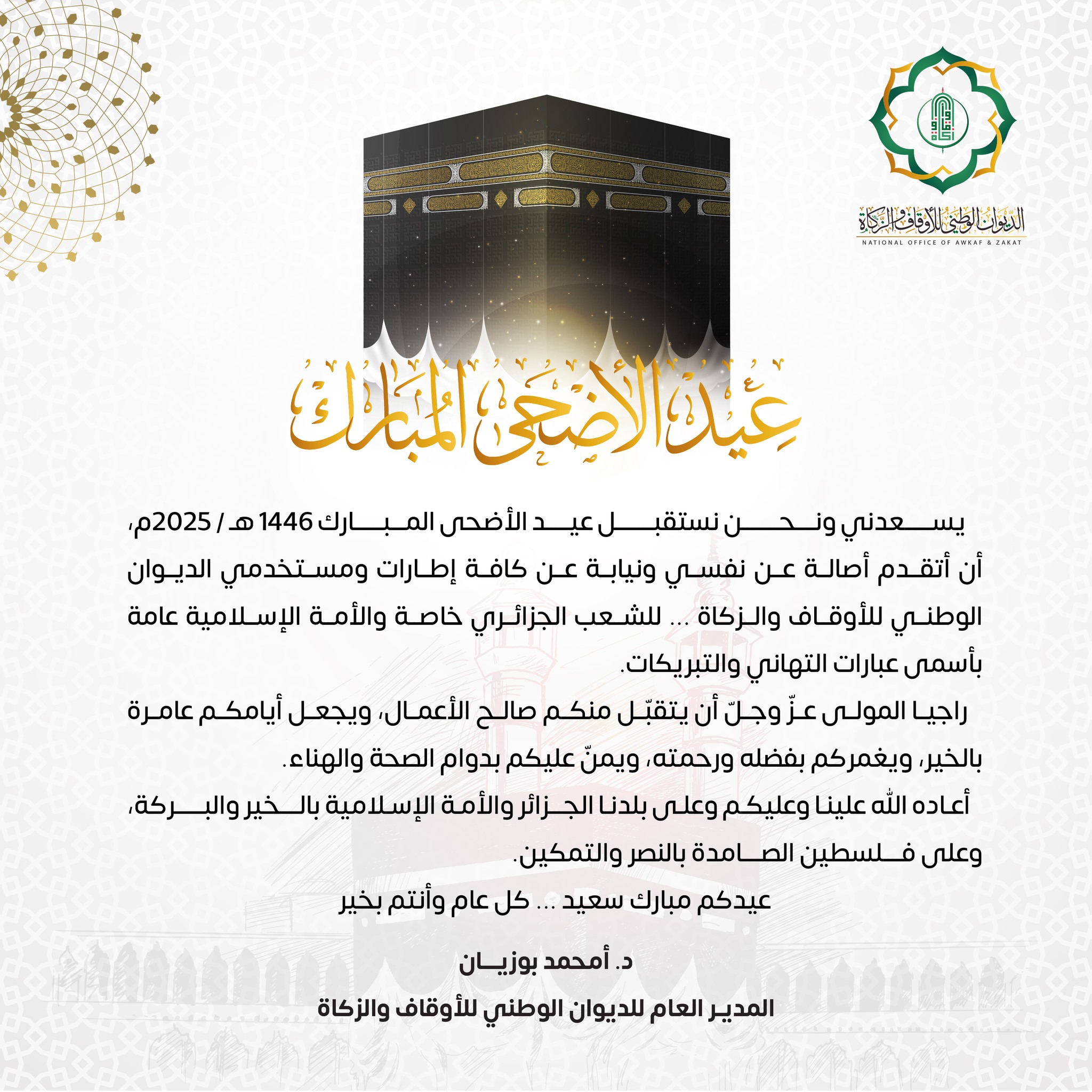 تهنئة المُدير العَام للدّيوَان الوَطَني للأوقَاف وَالزَّكاة “الدُّكتُور أمحمد بُوزيان” بمُناسبَة عيد الأضحَى المُبَارك 1446 هـ / 2025 م …عيدكُم مُبارَك … كُلُّ عَام وأنتُم بخَير