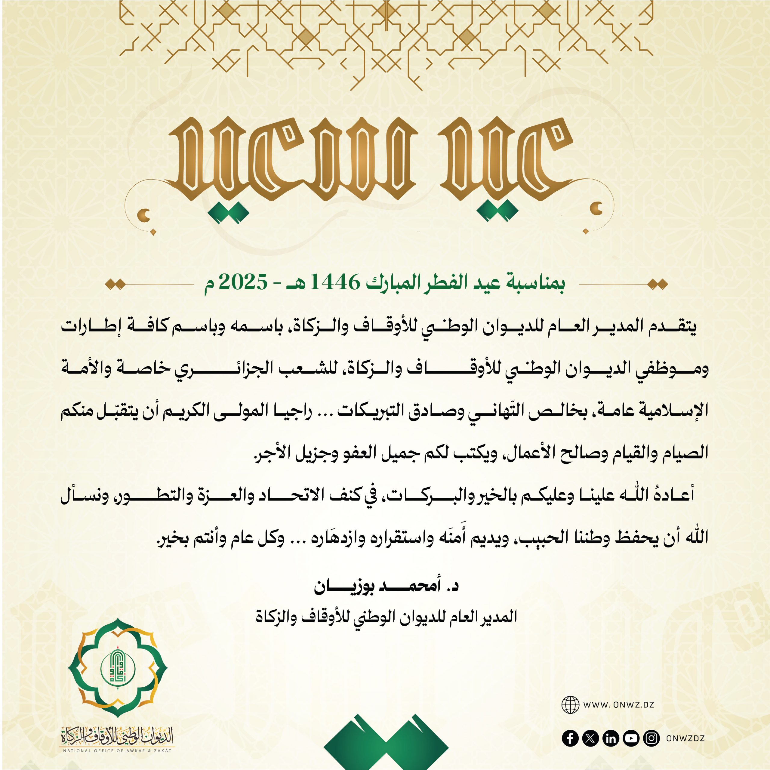 تهنئة المُدير العَام للدّيوَان الوَطَني للأوقَاف وَالزَّكاة ” الدُّكتُور أمحمد بُوزيان” بمُناسبَة عيد الفِطر المُبَارك 1446 هـ / 2025 م …