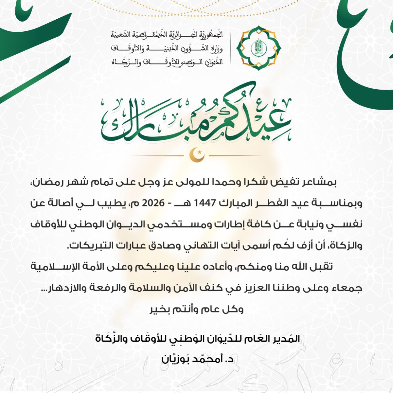 تهنئة المُدير العَام للدّيوَان الوَطَني للأوقَاف وَالزَّكاة ” الدُّكتُور أمحمد بُوزيان” بمُناسبَة عيد الفِطر المُبَارك 1447 هـ / 2026 م … عيدكُم مُبارَك … كُلُّ عَام وأنتُم بخَير.