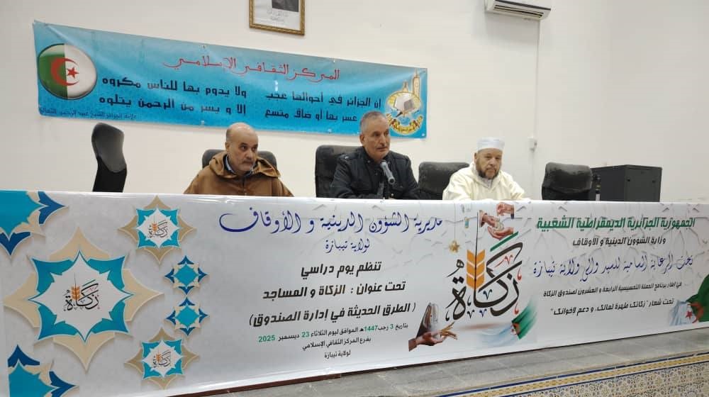 في إطار الحملة التحسيسية 24 لصندوق الزكاة تحت شعار “زكاتك طهرة لمالك و دعم لإخوانك” نظمت مديرية الشؤون الدينية و الأوقاف لولاية تيبازة يوم دراسي بعنوان – الزكاة و المساجد – (الطرق الحديثة في إدارة الصندوق) بالمركز الثقافي الإسلامي بتبازة.